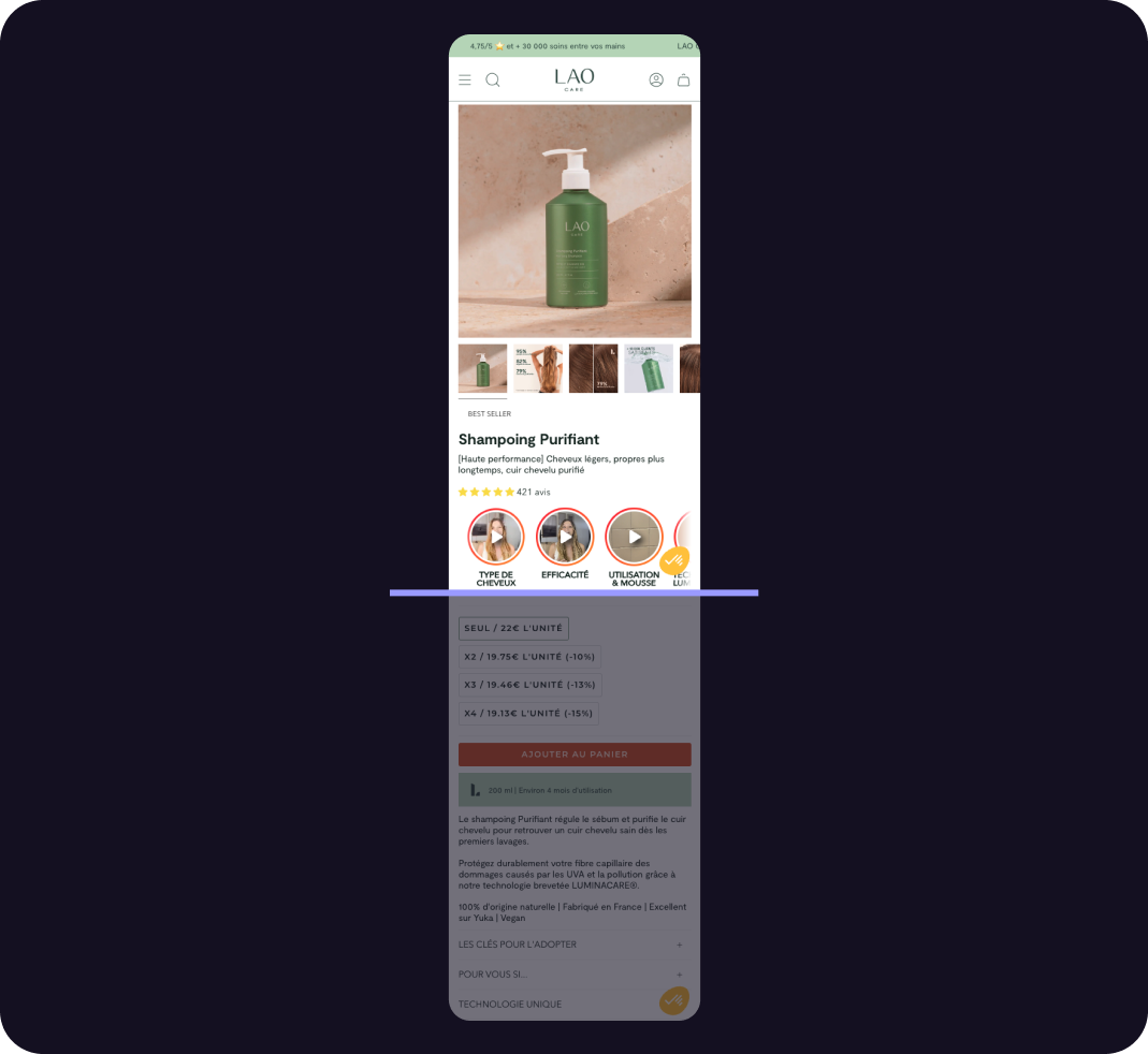Furthermore, this position ensures perfect visibility of the video without disrupting navigation, while remaining close to the essential call-to-action: the add-to-cart button. The customer thus benefits from a smooth experience, their purchasing journey is naturally guided, and the chances of completing the sale are maximized.